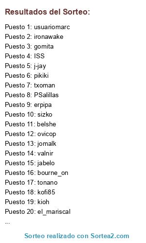 Lista de participantes: ovicop, valnir, sizko, jabelo, kioh, ISS, txoman, ironawake, el_mariscal, PSalillas, jomalk, erpipa, kofi85, belshe, bartulos, usuariomarc, tonano, pikiki, gomita, azucatriana, bourne_on, j-jay.