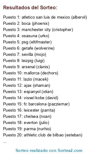 Lista de participantes: manchester united (fran), parma (nurhio), ajax (shaman), psg (eltifmaster), las palmas (rudyset), athletic club de bilbao (esteban), liverpool (meram), vissel kobe (david), rayo vallecano (nando), real oviedo (vene), osasuna (urko), fc barcelona (pazziemar), real betis balompie (buijin), atletico san luis de mexico (albervil), lazio (macek), dormund (elmoil), granada (rosino), everton (julio), chelsea (noan), real madrid (charly), new york city (isra), arsenal (clanis), sevilla (mojo), manchester city (cristopher), leizpig (luigi), espanyol (xtian), newcastle (dubraik), boca (phoenix), leicester (parrita), mallorca (dechors), valencia (racuma), getafe (wolverine).