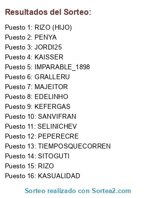 Lista de participantes: MAJEITOR, SANVIFRAN, SELINICHEV, TIEMPOSQUECORREN, JORDI25, PENYA, KAISSER, KASUALIDAD, IMPARABLE_1898, KEFERGAS, EDELINHO, GRALLERU, PEPERECRE, RIZO, RIZO (HIJO), SITOGUTI.