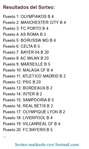 Lista de participantes: AS ROMA B 3, UD LAS PALMAS B 5, CELTA B 5, ATLETICO MADRID B 2, ATHLETIC BILBAO B 3, SAMPDORIA B 5, AC MILAN B 20, OLYMPIAKOS B 4, FC PORTO B 4, BORDEAUX B 2, FC BAYERN B 5, MANCHESTER CITY B 4, REAL BETIS B 2, OLYMPIQUE LYON B 2, VILLARREAL CF B 4, INTER B 2, PSG B 20, BORUSSIA MG B 4, BOR. DORTMUND B 4, BAYER 04 B 20, MARSEILLE B 5, WERDER BREMEN B 4, MALAGA CF B 4, LIVERPOOL B 4, ARSENAL B 2.
