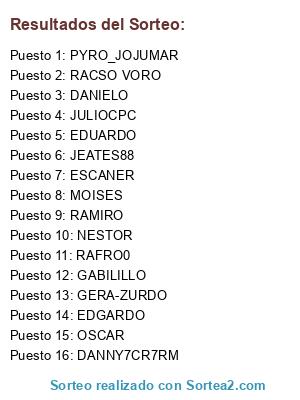 Lista de participantes: PYRO_JOJUMAR, RAFRO0, EDGARDO, JULIOCPC, JEATES88, DANNY7CR7RM, ESCANER, MOISES, GERA-ZURDO, NESTOR, GABILILLO, RAMIRO, RACSO VORO, DANIELO, EDUARDO, OSCAR.