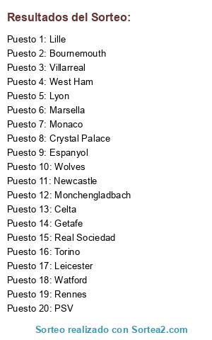 Lista de participantes: Leicester, Wolves, Real Sociedad, Getafe, Villarreal, Lyon, Celta, Monaco, Marsella, West Ham, Lille, PSV, Bournemouth, Torino, Monchengladbach, Newcastle, Espanyol, Watford, Crystal Palace, Rennes.