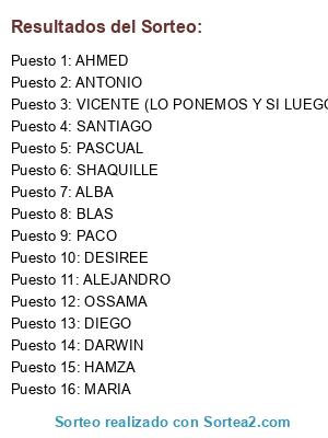 Lista de participantes: OSSAMA, ANTONIO, DESIREE, ALBA, PACO, HAMZA, AHMED, DARWIN, SHAQUILLE, BLAS, DIEGO, VICENTE (LO PONEMOS Y SI LUEGO NO QUIERE PARTICIPAR LO QUITAMOS), MARIA, ALEJANDRO, PASCUAL, SANTIAGO.