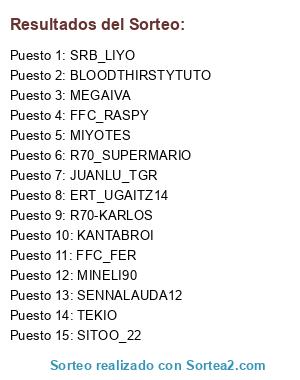 Lista de participantes: FFC_RASPY, SENNALAUDA12, BLOODTHIRSTYTUTO, ERT_UGAITZ14, R70-KARLOS, KANTABROI, SITOO_22, MEGAIVA, MIYOTES, MINELI90, JUANLU_TGR, SRB_LIYO, R70_SUPERMARIO, FFC_FER, TEKIO.