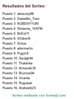 Lista de participantes: Thatanka, Saulgb94, Simeone_14ATM, Puga14, XGibertX, Brunora94, alexconp96, aitormartin, RUBENYYURI, BriEst11, Andrestb25, Schus, Armando35, Ruguwar, Danielillo_Travi, Vicente.