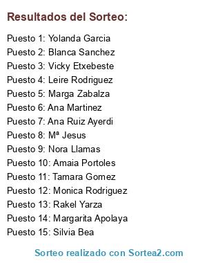 Lista de participantes: Idoia Llantos, Cecilia Martin, Amaia Jimenez, Yolanda Fernandez, Rosa Lana, Ainara Fernandez, Margarita Apolaya, Arantza Perez, Iratxe Sanchez, Mertxe Pintado, Mar Segura, Marga Zabalza, Marilu Agirre, Amaia Portoles, Reyes Granados, Lurdes Hernandez, Ainara Bea, Esther Hijosa, Blanca Sanchez, Maite Iturralde, Pili Del Olmo, Tamara Pacheco, Asun Gabirondo, Lieire Sanz, Eva Luzuriaga, Mari Jose Etxeberria, Ana Martinez, Elena Mangas, Olaia Peñagaricano, Leire Rodriguez, Yolanda Garcia, Vicky Etxebeste, Mari Jose MNartin, Monica Rodriguez, Coro Carrasqueda, Elena Miguel, Susana Prieto, Pepi Hidalgo, Silvia Bea, Nerea Mervaleja, Tamara Gomez, Nora Llamas, Mª Jesus, Rosa Garcia, Rakel Yarza, Fely Lucas, Wendhhy Obando, Ana Ruiz Ayerdi, Ana Sanpietro, Silvia Fernandez.
