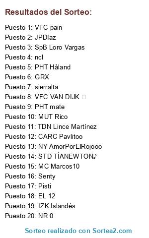 Lista de participantes: MUT Rico, ncl, NY AmorPorElRojooo, Senty, PHT mate, PHT Håland, NR 0, sierralta, VFC VAN DIJK ӝ, TDN Lince Martínez, CARC Pavlitoo, SpB Loro Vargas, Pisti, IZK Islandés, MC Marcos10, VFC pain, JPDíaz, EL 12, GRX, STD TÍANEWTON♪.