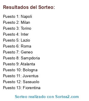 Lista de participantes: Juventus, Napoli, Roma, Milan, Inter, Lazio, Atalanta, Fiorentina, Sampdoria, Torino, Bologna, Geneo, Sassuolo.