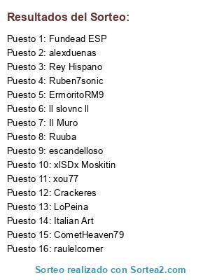 Lista de participantes: LoPeina, Italian Art, escandelloso, ErmoritoRM9, Il Muro, Ruuba, Rey Hispano, xou77, Fundead ESP, Ruben7sonic, xlSDx Moskitin, raulelcorner, ll slovnc ll, Crackeres, alexduenas, CometHeaven79.
