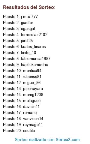 Lista de participantes: ogasgal, migue_86, kratos_linares, piponayara, j-m-c-777, malagueo, vanvicen14, davicin11, ceutito, finito_10, romario, rubenss81, fabiomurcia1987, jordi25, reymago11, montixx94, jpadfor, mamg1208, hapilukamodric, torresdiaz2102.