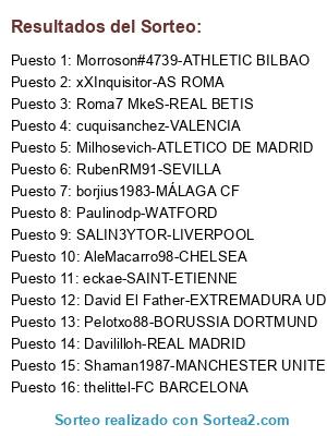 Lista de participantes: eckae-SAINT-ETIENNE, RubenRM91-SEVILLA, Shaman1987-MANCHESTER UNITED, borjius1983-MÁLAGA CF, David El Father-EXTREMADURA UD, Pelotxo88-BORUSSIA DORTMUND, xXInquisitor-AS ROMA, Morroson#4739-ATHLETIC BILBAO, thelittel-FC BARCELONA, SALIN3YTOR-LIVERPOOL, Paulinodp-WATFORD, Milhosevich-ATLETICO DE MADRID, Davililloh-REAL MADRID, cuquisanchez-VALENCIA, AleMacarro98-CHELSEA, Roma7 MkeS-REAL BETIS.