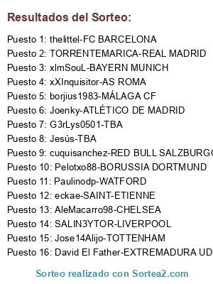 Lista de participantes: eckae-SAINT-ETIENNE, Pelotxo88-BORUSSIA DORTMUND, xXInquisitor-AS ROMA, Jose14Alijo-TOTTENHAM, xlmSouL-BAYERN MUNICH, thelittel-FC BARCELONA, Joenky-ATLÉTICO DE MADRID, SALIN3YTOR-LIVERPOOL, borjius1983-MÁLAGA CF, David El Father-EXTREMADURA UD, cuquisanchez-RED BULL SALZBURGO, Paulinodp-WATFORD, AleMacarro98-CHELSEA, TORRENTEMARICA-REAL MADRID, G3rLys0501-TBA, Jesús-TBA.