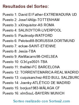 Lista de participantes: eckae-SAINT-ETIENNE, Pelotxo88-BORUSSIA DORTMUND, xXInquisitor-AS ROMA, Jose14Alijo-TOTTENHAM, xlmSouL-BAYERN MUNICH, thelittel-FC BARCELONA, Joenky-ATLÉTICO DE MADRID, SALIN3YTOR-LIVERPOOL, borjius1983-MÁLAGA CF, David El Father-EXTREMADURA UD, cuquisanchez-RED BULL SALZBURGO, Paulinodp-WATFORD, AleMacarro98-CHELSEA, TORRENTEMARICA-REAL MADRID, G3rLys0501-TBA, Jesús-TBA.