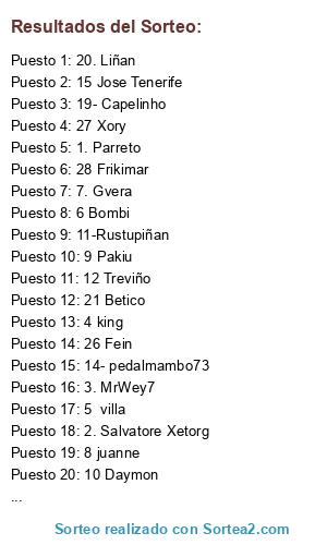 Lista de participantes: 1. Parreto, 2. Salvatore Xetorg, 3. MrWey7, 4 king, 5 villa, 6 Bombi, 7. Gvera, 8 juanne, 9 Pakiu, 10 Daymon, 11-Rustupiñan, 12 Treviño, 13 PEDROFOX, 14- pedalmambo73, 15 Jose Tenerife, 16. ProRaiven14, 17. Guille, 18 - Roko, 19- Capelinho, 20. Liñan, 21 Betico, 22 Rodri MR07, 23 iborra85, 24 Nutria, 25-Arteroman, 26 Fein, 27 Xory, 28 Frikimar.