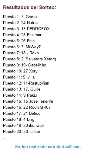 Lista de participantes: 1. Parreto, 2. Salvatore Xetorg, 3. MrWey7, 4 king, 5 villa, 6 Bombi, 7. Gvera, 8 juanne, 9 Pakiu, 10 Daymon, 11-Rustupiñan, 12 Treviño, 13 PEDROFOX, 14- pedalmambo73, 15 Jose Tenerife, 16. ProRaiven14, 17. Guille, 18 - Roko, 19- Capelinho, 20. Liñan, 21 Betico, 22 Rodri MR07, 23 iborra85, 24 Nutria, 25-Arteroman, 26 Fein, 27 Xory, 28 Frikimar.