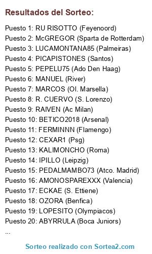 Lista de participantes: FERMINNN (Flamengo), RAIVEN (Ac Milan), EMILIO UCHA (Racing Club), R. CUERVO (S. Lorenzo), ECKAE (S. Ettiene), OSDOBLA (Ol. Lyon), MARCOS (Ol. Marsella), IPILLO (Leipzig), LUIZAO (Ajax), LOPESITO (Olympiacos), OZORA (Benfica), SENTENZA (Botafogo), AMONOSPAREXXX (Valencia), CAPELINHO (B. Dortmund), CEXAR1 (Psg), OSCARZAWA (Shaktar Donetsk), PADRONE (Zenit), IBORRA (Napoles), SULLENDONKEY (Schalke), MAXI (Barcelona), KALIMONCHO (Roma), MINDIX (Liverpool), MANUEL (River), SEGO (Monaco), BETICO2018 (Arsenal), PICAPISTONES (Santos), PEDALMAMBO73 (Atco. Madrid), LUCAMONTANA85 (Palmeiras), McGREGOR (Sparta de Rotterdam), PEPELU75 (Ado Den Haag), ABYRRULA (Boca Juniors), RU RISOTTO (Feyenoord).