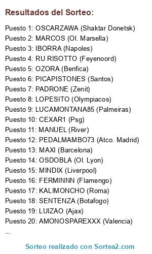 Lista de participantes: FERMINNN (Flamengo), RAIVEN (Ac Milan), EMILIO UCHA (Racing Club), R. CUERVO (S. Lorenzo), ECKAE (S. Ettiene), OSDOBLA (Ol. Lyon), MARCOS (Ol. Marsella), IPILLO (Leipzig), LUIZAO (Ajax), LOPESITO (Olympiacos), OZORA (Benfica), SENTENZA (Botafogo), AMONOSPAREXXX (Valencia), CAPELINHO (B. Dortmund), CEXAR1 (Psg), OSCARZAWA (Shaktar Donetsk), PADRONE (Zenit), IBORRA (Napoles), SULLENDONKEY (Schalke), MAXI (Barcelona), KALIMONCHO (Roma), MINDIX (Liverpool), MANUEL (River), SEGO (Monaco), BETICO2018 (Arsenal), PICAPISTONES (Santos), PEDALMAMBO73 (Atco. Madrid), LUCAMONTANA85 (Palmeiras), McGREGOR (Sparta de Rotterdam), PEPELU75 (Ado Den Haag), ABYRRULA (Boca Juniors), RU RISOTTO (Feyenoord).