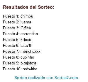 Lista de participantes: Gtflea, vilches97, solracamo, eljuanki13, el_josal, cupinho, marcoberrio, ivantfe, correntino, heirinsinho, masterofpicks, latu78, cintus, daniblamed, menchuxxx, caskito, killoso, tv-gol.com.ar, redwithe, miguelpro, manulo10, titan93, chimbu, isidorox, marckwire21, juanra, HPG67, pirujotote.