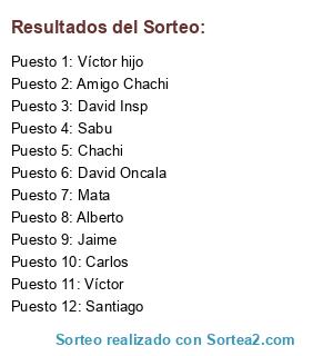Lista de participantes: Víctor hijo, Víctor, Alberto, Chachi, Carlos, David Oncala, Jaime, Santiago, Sabu, David Insp, Mata, Amigo Chachi.