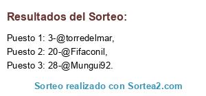 Lista de participantes: 1-@Jafedi,, 2-@kurrillo,, 3-@torredelmar,, 4-@kriun10,, 5-@mourinho1980,, 7-@Ovejanegra,, 8-@Xavisik,, 9-@iFAMEZz,, 10-@Angarals,, 11-@Er-Moi14,, 12-@OscarVilla7,, 13-@Carlos-12,, 14-@Damacu,, 15-@ll-faraone92,, 16-@eder69,, 17-@Awaxumi,, 18-@Bayern16,, 20-@Fifaconil,, 21-@Pohque,, 22-@MarkHenryFan,, 23-@Kevama,, 24-@Migueinsua,, 26-@DieguiitoLoSy11,, 27-@Nicognr,, 28-@Mungui92..