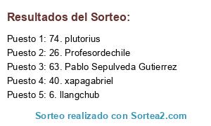Lista de participantes: 1. Juanky.one, 2. ZetaSoujiro, 3. Jonatanlou, 4. Pitoniso, 5. ZOMBlE, 6. llangchub, 7. KONDOR NEGRO, 8. Jotham Cristian, 9. SerpienteMan, 10. Chimboroka, 11. Glak4urrS, 12. niidh, 13. mujamedsimi, 14. Gerrero88, 15. shumingo, 16. Slordak, 17. Jarlok, 18. koloro666, 19. El.Goma D, 20. Miguel Smith, 21. Wauro21, 22. linker155, 23. wisepiii84, 24. Benjamin Wellmann, 25. no quedaban nombres, 26. Profesordechile, 27. shipamogli, 28. Quilterrier, 29. bastianjara29, 30. row2012, 31. DarkSnake85, 33. Huasoemier, 35. tte. spears, 36. Zcuta, 39. Doctor.T, 40. xapagabriel, 42. Derack182, 43. HolyGrailCL, 44. j...0, 45. MoccaCL, 47. vencer o morir, 48. Rathdir, 49. manuel del burro, 50. Space1111, 51. EnconXV, 52. Nebiros Zaruel Sohma Kusanagi, 54. lDark Soul, 55. RMNRX, 57. Mierdozox, 58. Antuche, 60. AndresReyes, 61. Chitauri, 62. Alexcrack20, 63. Pablo Sepulveda Gutierrez, 66. Ciscop87, 67. Deskra, 68. ManuMar, 69. sebaldea21, 70. chunchokarateka, 72. fernando zuniga, 74. plutorius, 75. Rodrigo Orellana, 76. Killua Lion, 77. Souxx, 78. Panxo.0, 79. Fernando Toro, 80. ASD10S.