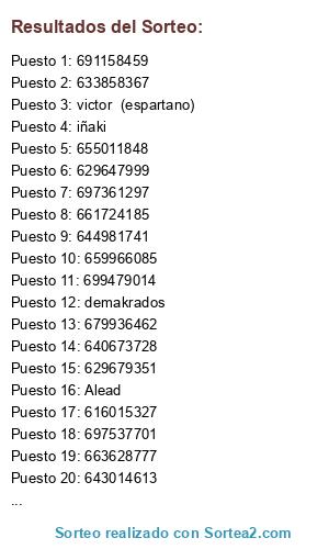 Lista de participantes: Chusco, Adrilol, Alead, 699479014, demakrados, victor (espartano), iñaki, javi ( itdevals), juanliti, 690860777, 616015327, 616252383, 620173812, 629647999, 629679351, 630114863, 633111283, 633858367, 640673728, 643014613, 644981741, 654597653, 655011848, 655784719, 659966085, 661724185, 663628777, 679936462, 691158459, 697361297, 697537701, Gabriel.