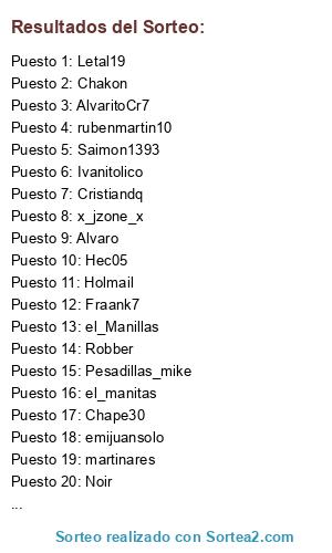 Lista de participantes: Mariete90, Fraank7, Holmail, Robber, Alvaro, el_manitas, Chakon, Noir, Cristiandq, el_Manillas, AlvaritoCr7, Chape30, rubenmartin10, Letal19, Acidcold, Alvaro_231299, x_jzone_x, martinares, Ivanitolico, emijuansolo, julianhr, Pesadillas_mike, Saimon1393, Hec05.
