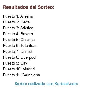 Lista de participantes: Totenham, Barcelona, Liverpool, Arsenal, Bayern, Chelsea, Madrid, Atlético, Celta, City, United.