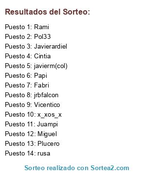 Lista de participantes: Vicentico, Papi, Javierardiel, Pol33, javierm(col), Plucero, Rami, jrbfalcon, x_xos_x, Fabri, Miguel, Juampi, Cintia, rusa.