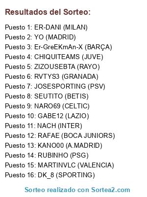 Lista de participantes: YO (MADRID), DK_8 (SPORTING), CHIQUITEAMS (JUVE), Er-GreEKmAn-X (BARÇA), ZIZOUSEBTA (RAYO), GABE12 (LAZIO), RVTYS3 (GRANADA), RUBINHO (PSG), NACH (INTER), ER-DANI (MILAN), JOSESPORTING (PSV), SEUTITO (BETIS), RAFAE (BOCA JUNIORS), KANO00 (A.MADRID), MARTINVLC (VALENCIA), NARO69 (CELTIC).