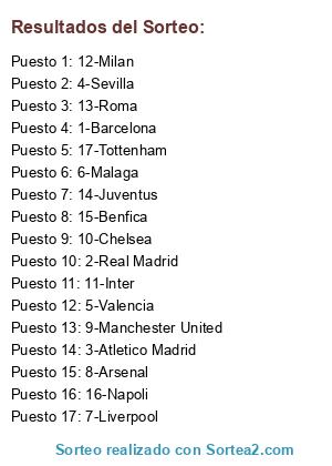 Lista de participantes: 1-Barcelona, 2-Real Madrid, 3-Atletico Madrid, 4-Sevilla, 5-Valencia, 6-Malaga, 7-Liverpool, 8-Arsenal, 9-Manchester United, 10-Chelsea, 11-Inter, 12-Milan, 13-Roma, 14-Juventus, 15-Benfica, 16-Napoli, 17-Tottenham.