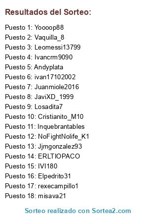 Lista de participantes: rexecampillo1, Leomessi13799, JaviXD_1999, Juanmiole2016, Inquebrantables, Jjmgonzalez93, ivan17102002, NoFightNolife_K1, Yoooop88, IVI180, Losadita7, misava21, ERLTIOPACO, Ivancrm9090, Cristianito_M10, Elpedrito31, Andyplata, Vaquilla_8.