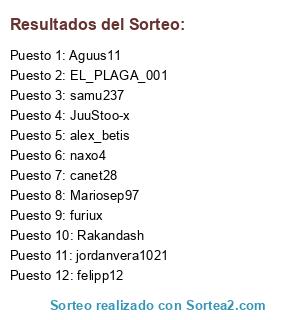 Lista de participantes: JuuStoo-x, Rakandash, Mariosep97, alex_betis, jordanvera1021, naxo4, felipp12, furiux, EL_PLAGA_001, samu237, Aguus11, canet28.