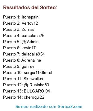 Lista de participantes: @ Admin, cheroqui22, @ Rusinho83, sergio1188rmcf, Adrenaline, Skinwalker, BULGARO 04, Ironspain, delacalle954, kevin17, Vertov12, Zorriss, barcelona26, gonrev.