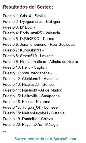 Lista de participantes: Nashoif9 - At de Madrid, Acus7 - Roma, Coqe - Lazio, Psycha07ic - Málaga, Turgon_04 - Udinese, Boris_azul25 - Valencia, D1E6O -, Cris14 - Sevilla, Dyegoandres - Bologna, Lalitovilla - Sampdoria, Nicolas23 - Genoa, DJMiKEKO - Parma, Kurosaki191 -, Feliu - Cagliari, Fnatic - Palermo, Danielillo - Chievo, Nicolasmathias - Athetic de Bilbao, NelsonLucybell - Catania, Jona.fenomeno - Real Sociedad, bstn_wrogspace -, Smert619 - Levante, Clarkkent1 - Atalanta.