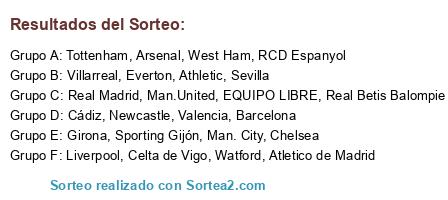 Lista de participantes: Barcelona, Real Madrid, Cádiz, Man.United, Everton, Real Betis Balompie, Athletic, West Ham, Tottenham, Man. City, Chelsea, Arsenal, Liverpool, Newcastle, Watford, EQUIPO LIBRE, Sevilla, Villarreal, Girona, Valencia, Atletico de Madrid, RCD Espanyol, Celta de Vigo, Sporting Gijón.