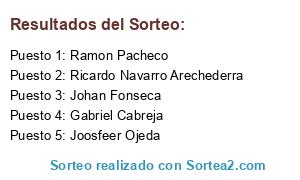 Lista de participantes: Gabriel Cabreja , Ramon Pacheco , Johan Fonseca , Joosfeer Ojeda , Ricardo Navarro Arechederra.