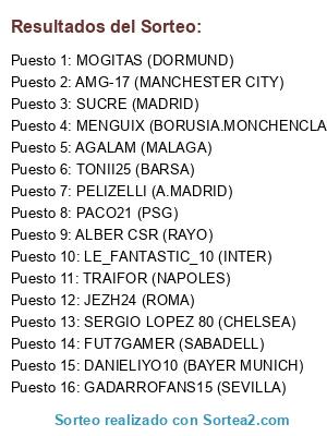 Lista de participantes: SUCRE (MADRID), JEZH24 (ROMA), ALBER CSR (RAYO), MOGITAS (DORMUND), PELIZELLI (A.MADRID), LE_FANTASTIC_10 (INTER), AGALAM (MALAGA), TRAIFOR (NAPOLES), MENGUIX (BORUSIA.MONCHENCLADBACH), TONII25 (BARSA), SERGIO LOPEZ 80 (CHELSEA), GADARROFANS15 (SEVILLA), DANIELIYO10 (BAYER MUNICH), FUT7GAMER (SABADELL), AMG-17 (MANCHESTER CITY), PACO21 (PSG).