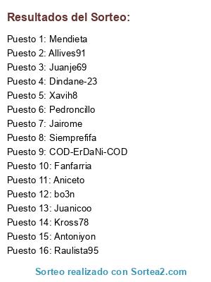 Lista de participantes: Juanicoo, Allives91, Aniceto, bo3n, COD-ErDaNi-COD, Dindane-23, Raulista95, Antoniyon, Fanfarria, Jairome, Mendieta, Pedroncillo, Siemprefifa, Xavih8, Juanje69, Kross78.