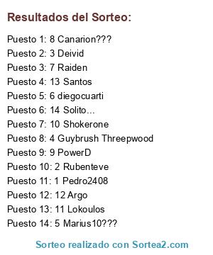 Lista de participantes: Pedro2408, Rubenteve, Deivid, Guybrush Threepwood, Marius10???, diegocuarti, Raiden, Canarion???, PowerD, Shokerone, Lokoulos, Argo, Santos, Solito....
