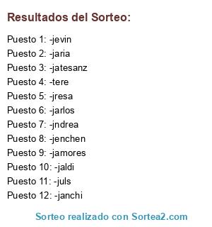 Lista de participantes: -tere, -jevin, -juls, -jaldi, -jresa, -jatesanz, -jndrea, -jamores, -jarlos, -janchi, -jaria, -jenchen.
