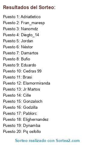 Lista de participantes: Gonzaloch, Fran_maresp, Eduardo, Diegto_14, Nanomdz, Jordan, Elighernandez, Néstor, Godzilla, Pablorc, Elamormiranda, Dynamba, Cedras 99, Brasi, Damartos, Cille, Pq osfollo, Bufio, Adriatletico, Jr Martos.