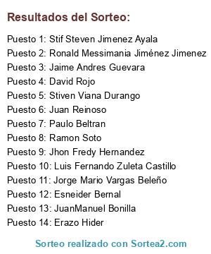 Lista de participantes: Ronald Messimania Jiménez Jimenez, Paulo Beltran, Esneider Bernal, Ramon Soto, Erazo Hider, Luis Fernando Zuleta Castillo, Stiven Viana Durango, Juan Reinoso, Jaime Andres Guevara, Jorge Mario Vargas Beleño, JuanManuel Bonilla, Stif Steven Jimenez Ayala, Jhon Fredy Hernandez, David Rojo.