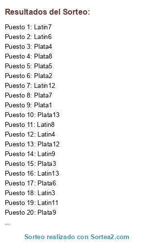Lista de participantes: Latin1, Plata1, Latin2, Plata2, Latin3, Plata3, Latin4, Plata4, Latin5, Plata5, Latin6, Plata6, Latin7, Plata7, Latin8, Plata8, Latin9, Plata9, Latin10, Plata10, Latin11, Plata11, Latin12, Plata12, Latin13, Plata13.