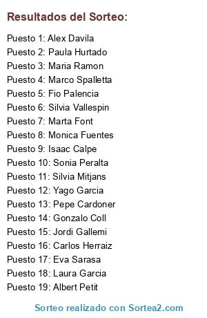 Lista de participantes: Isaac Calpe, Pepe Cardoner, Gonzalo Coll, Alex Davila, Marta Font, Monica Fuentes, Jordi Gallemi, Laura Garcia, Yago Garcia, Carlos Herraiz, Paula Hurtado, Silvia Mitjans, Fio Palencia, Sonia Peralta, Albert Petit, Maria Ramon, Eva Sarasa, Marco Spalletta, Silvia Vallespin.