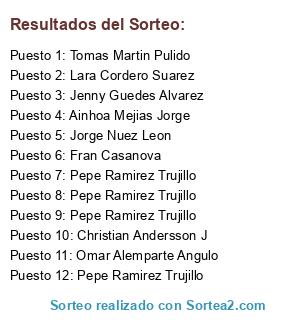 Lista de participantes: Pepe Ramirez Trujillo , Pepe Ramirez Trujillo , Pepe Ramirez Trujillo , Pepe Ramirez Trujillo , Christian Andersson J, Lara Cordero Suarez, Jorge Nuez Leon, Tomas Martin Pulido, Jenny Guedes Alvarez, Fran Casanova, Omar Alemparte Angulo, Ainhoa Mejias Jorge.