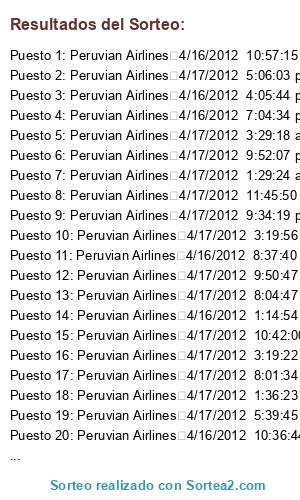 - Puesto 1: Peruvian Airlines 4/16/2012 10:57:15 p.m. 88915 USD 144.59