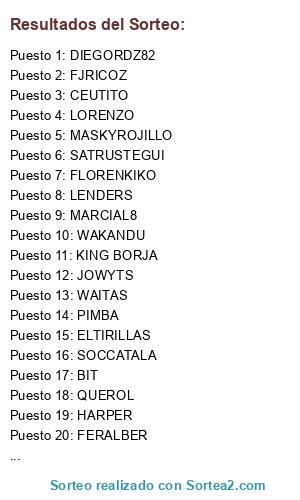 Lista de participantes: LENDERS, JAMFUS, SIMARRO, MASKYROJILLO, WAKANDU, ELTIRILLAS, CEUTITO, FLORENKIKO, FJRICOZ, DIEGORDZ82, MAKAROOV, HARPER, EL MERCU.