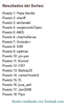 Lista de participantes: Pepe Sevilla, Ivan_Colchonero, S3R, Pj, elchandal, sheriff, Javi2008, Kurunir, AMS, sadman, chacheNavas, sergiocrack23pes, carlos7madrid, (Sin Usuario), Barbas25, Pipo, jove_adri, Gonzalo.r, CR7.