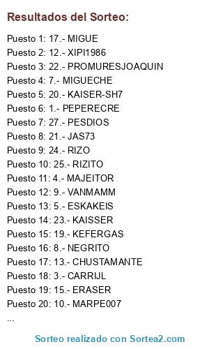 Lista de participantes: PEPERECRE, CORTEX, CARRIJL, MAJEITOR, ESKAKEIS, DONBLADELEZO, MIGUECHE, NEGRITO, VANMAMM, MARPE007, TXAKAAL, XIPI1986, CHUSTAMANTE, JAVIAN, ERASER, IMPARABLE, MIGUE, ALEPGL, KEFERGAS, KAISER-SH7, JAS73, PROMURESJOAQUIN, KAISSER, RIZO, RIZITO, LEGOLAS, PESDIOS, RAMOS.